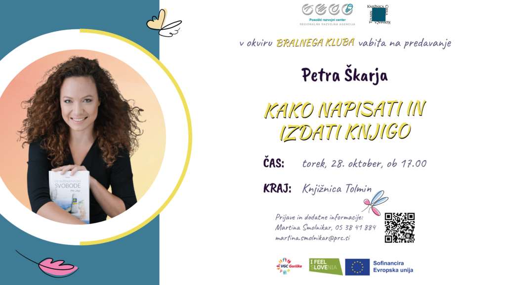 Bralni klub Posoškega razvojnega centra in Knjižnica Tolmin vas vabita na srečanje s Petro Škarja. Tema srečanja bo Kako napisati in izdati knjigo – vabljeni pa ste vsi, ne le tisti, ki želite pisati, temveč tudi tisti, ki bi radi osebno spoznali avtorico.