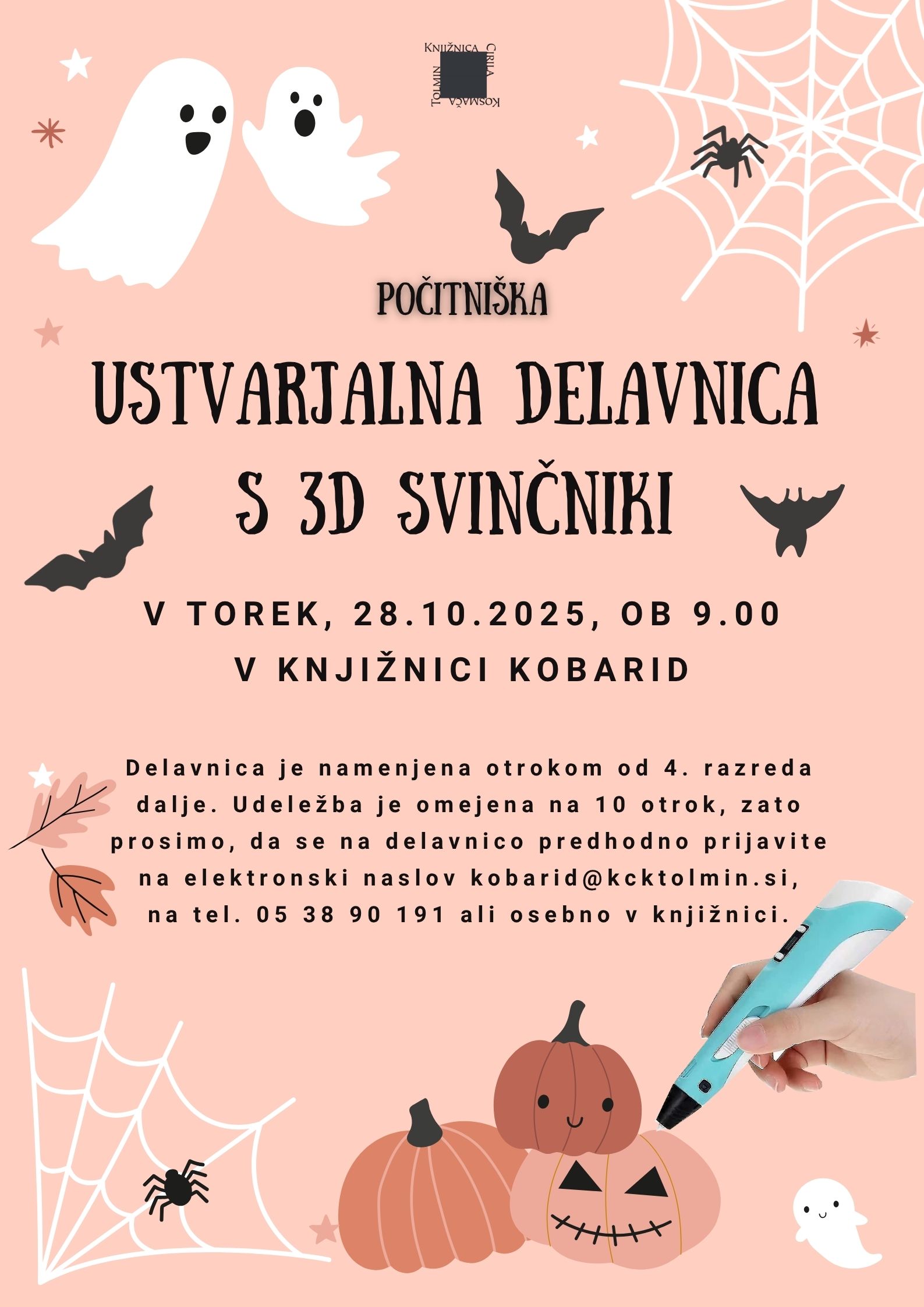 Skoči na glavno vsebino Ustvarjalna delavnica s 3D svinčniki Ustvarjalna delavnica s 3D svinčniki – Knjižnica Cirila Kosmača Tolmin