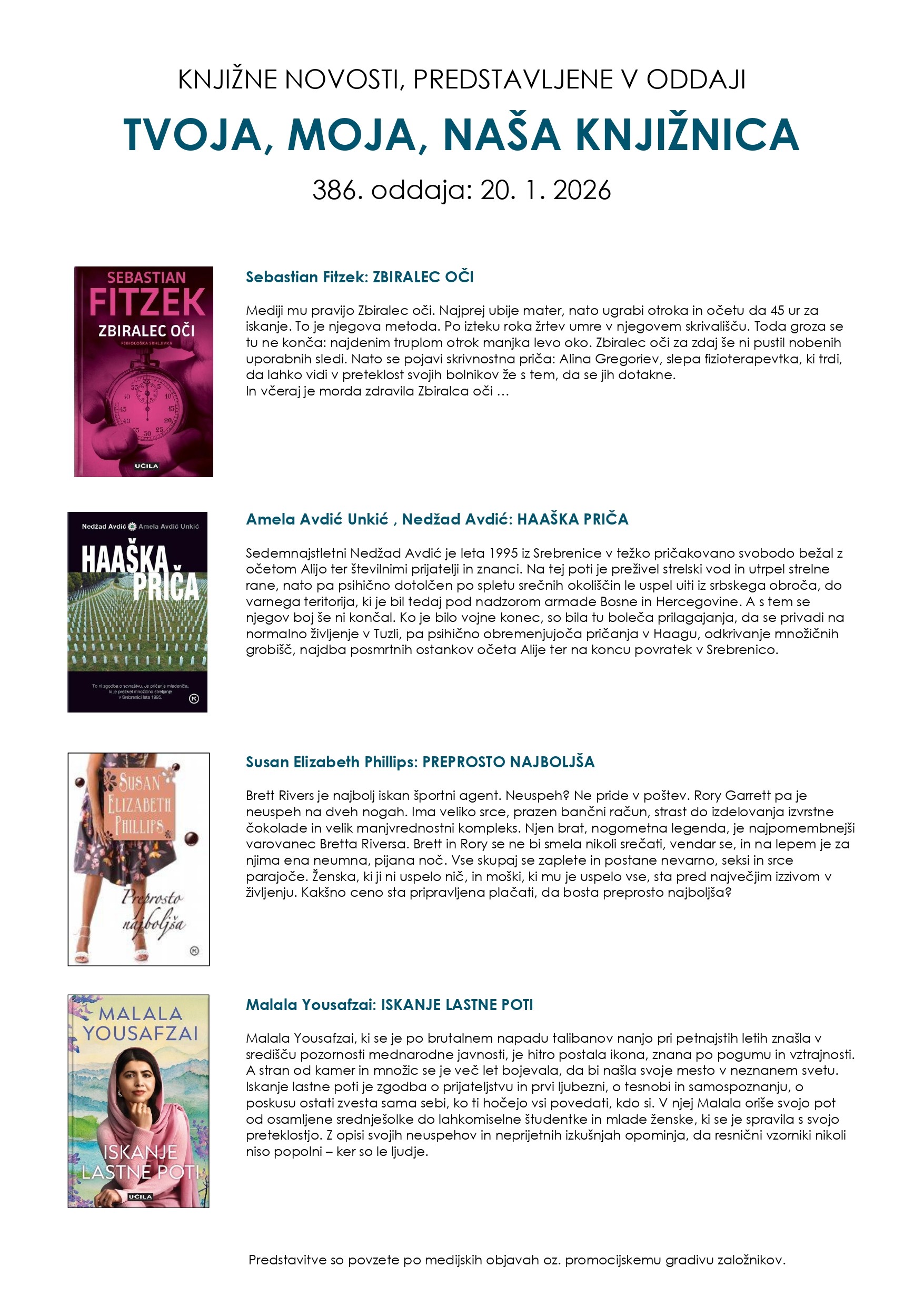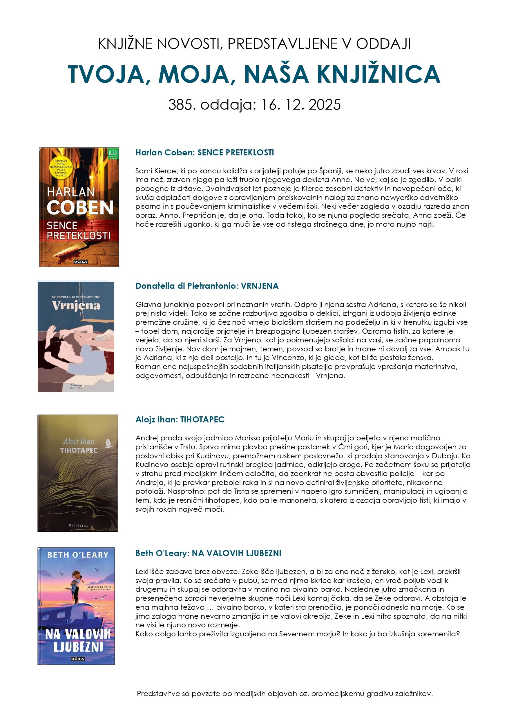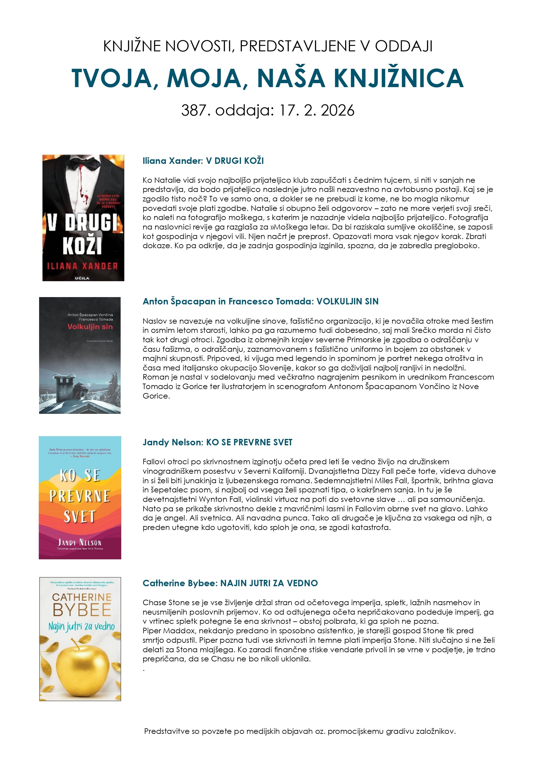 Oddaja Tvoja, moja, naša knjižnica obvešča o knjižnih novitetah, novih projektih, prireditvah in storitvah, ki jih ponuja knjižnica. Poslušalcem v branje priporoča zanimiva literarna dela, promovira nagrajene knjige in predstavlja zanimivosti iz sveta knjig in knjižnic.