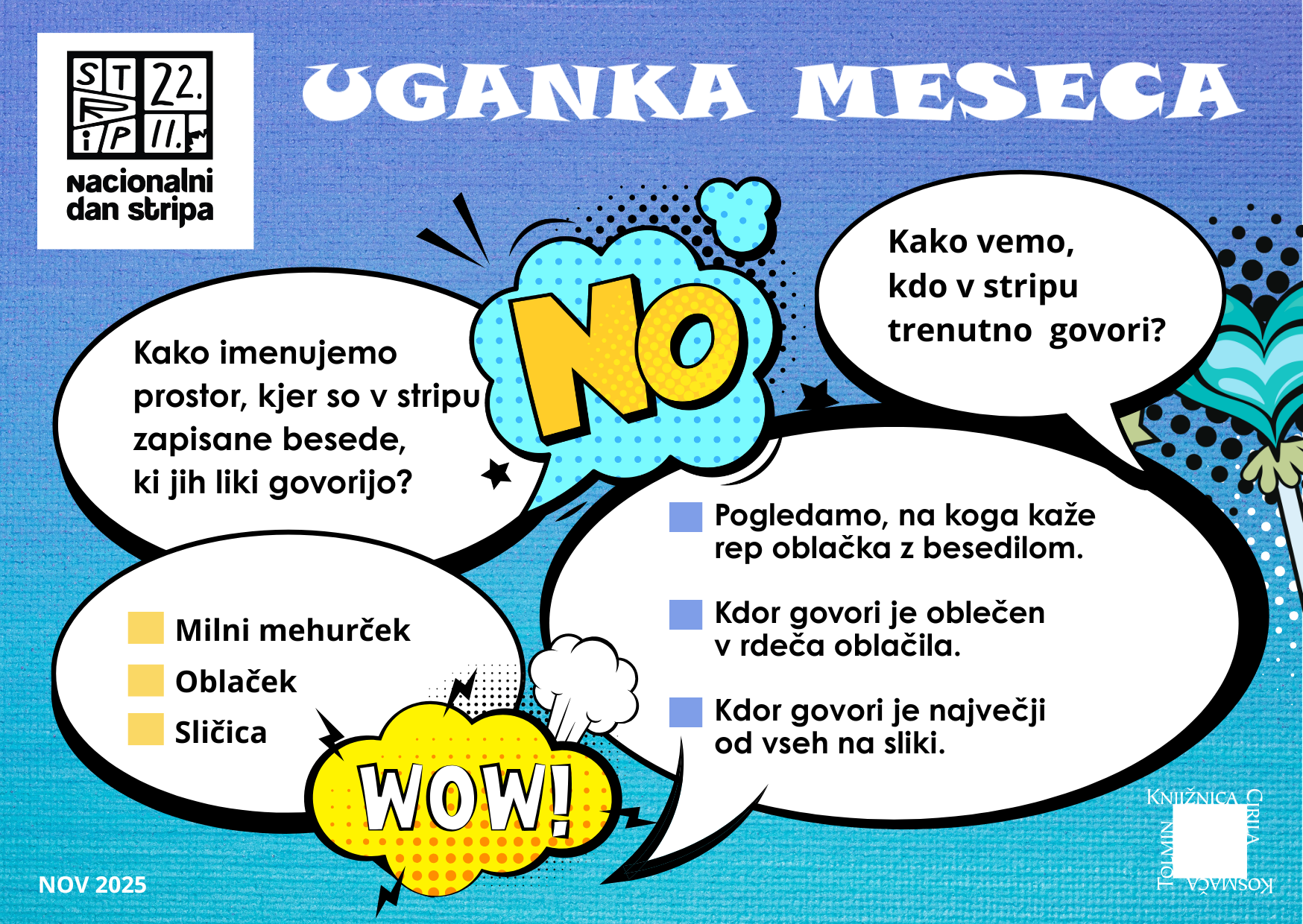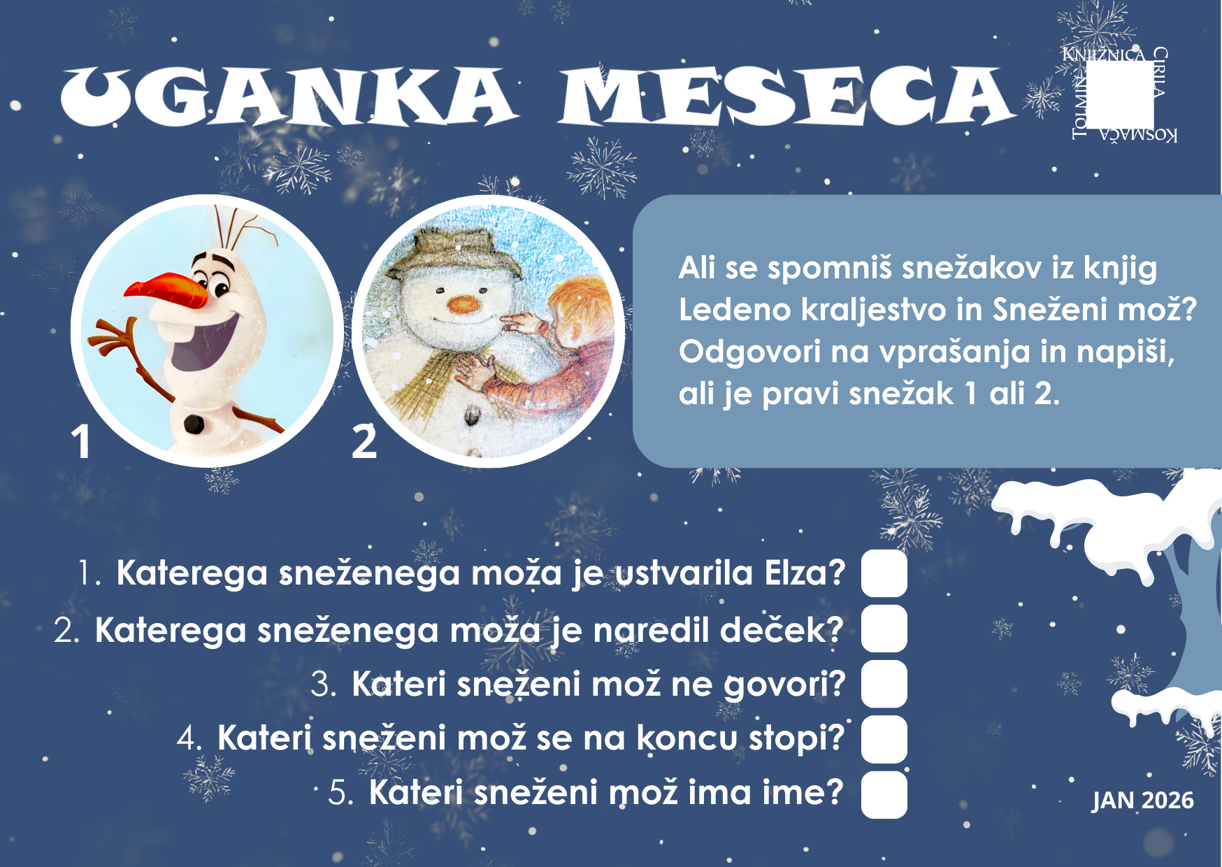 V Knjižnici Cirila Kosmača Tolmin vsak mesec pripravimo tematsko uganko za otroke. Vsak mesec tudi izžrebamo tri nagrajence, ki nagrado prejmejo po pošti. Zato ne pozabi pripisati svoje članske številke, da te bomo lahko obvestili, če boš srečni izžrebanec oziroma izžrebanka.