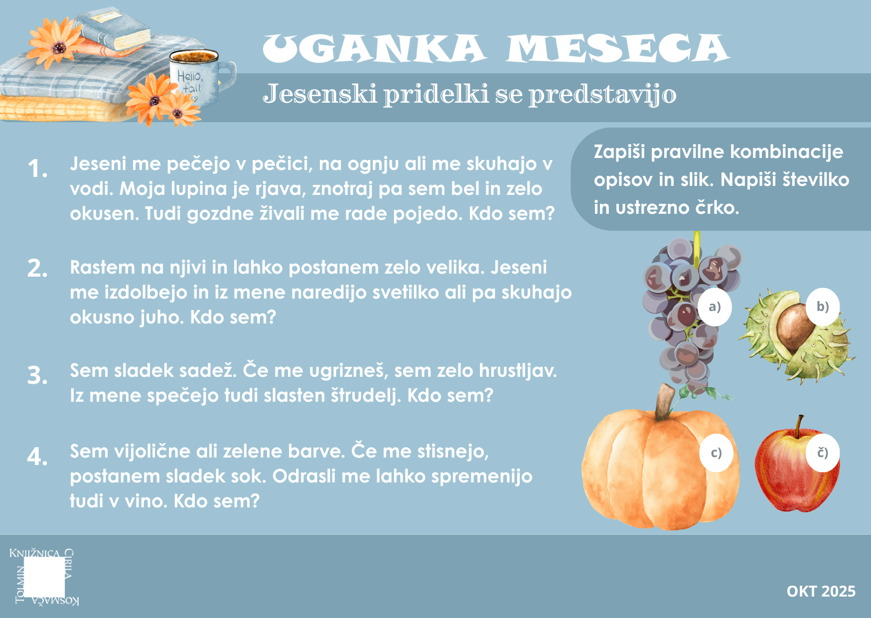 - Ob obisku knjižnice v Tolminu, v Kobaridu, v Bovcu ali Potujoče knjižnice rešiš natisnjeno uganko.