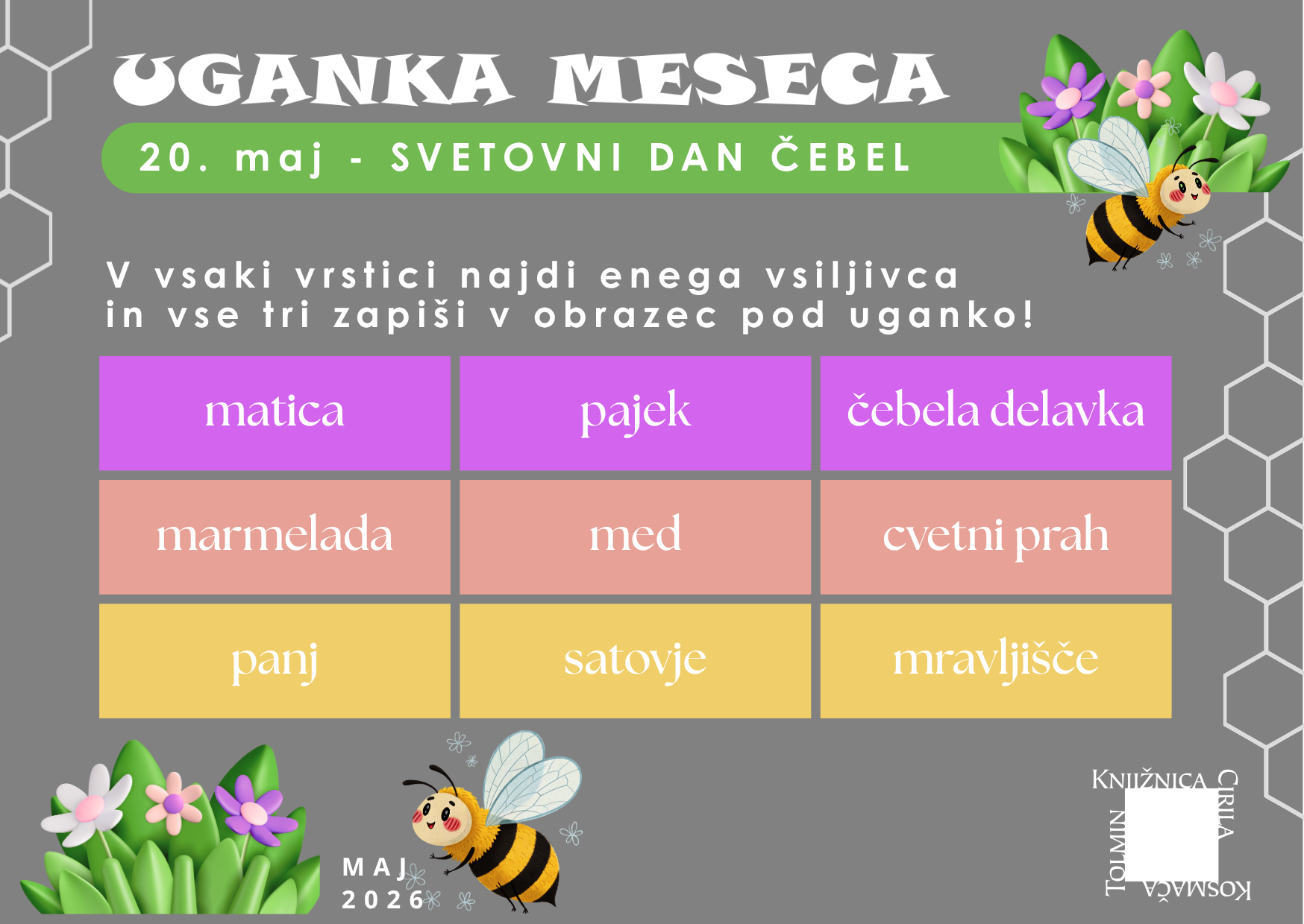 V Knjižnici Cirila Kosmača Tolmin vsak mesec pripravimo tematsko uganko za otroke. Vsak mesec tudi izžrebamo tri nagrajence, ki nagrado prejmejo po pošti. Zato ne pozabi pripisati svoje članske številke, da te bomo lahko obvestili, če boš srečni izžrebanec oziroma izžrebanka.